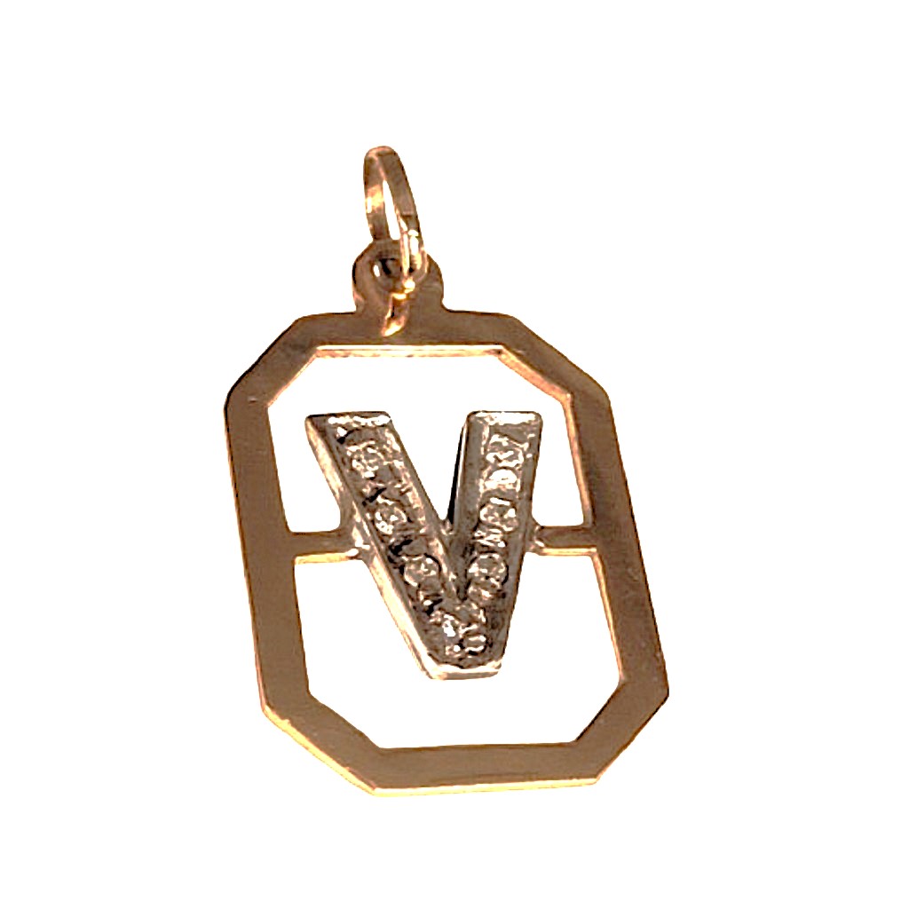 Vintage 14k yellow gold pave set diamond “V” initial pendant. This pendant features the letter “V” initial suspended in the center of an octagon shape designed frame. The initial is set with seven diamonds. The pendent weight is approximately 0.85 grams, marked “14k” on the back side corner edge.
