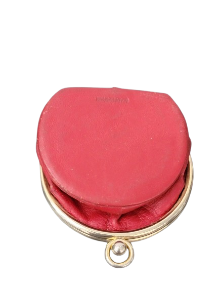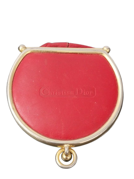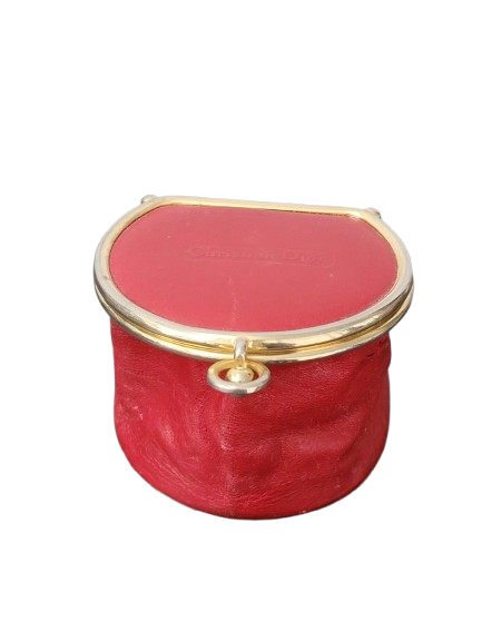 Christian Dior vintage red leather collapsible coin purse. The pouch is stamped “Christian Dior” on top of lid, inside name letters are stamped in gold. The coin pouch has gold tone metal hardware trim, and a kiss lock snap closure. On the bottom it is stamped made in Spain.