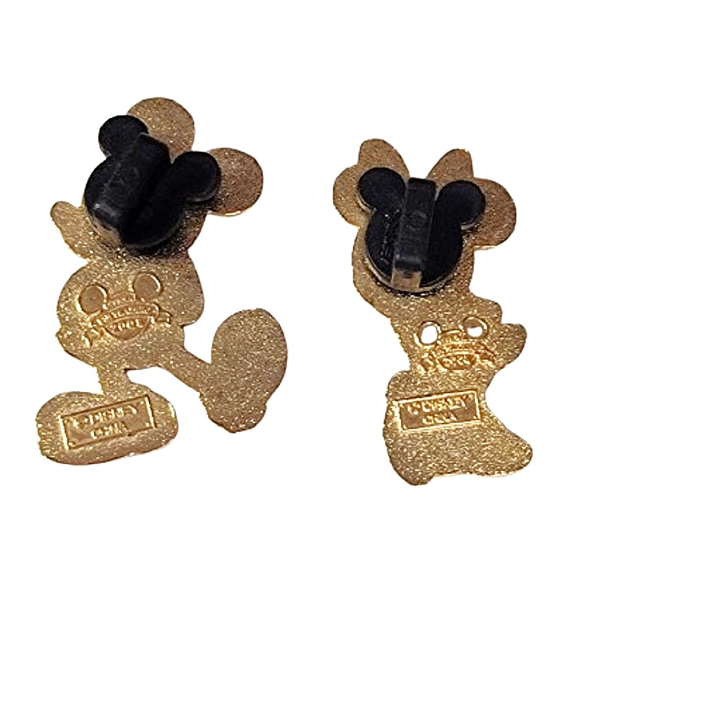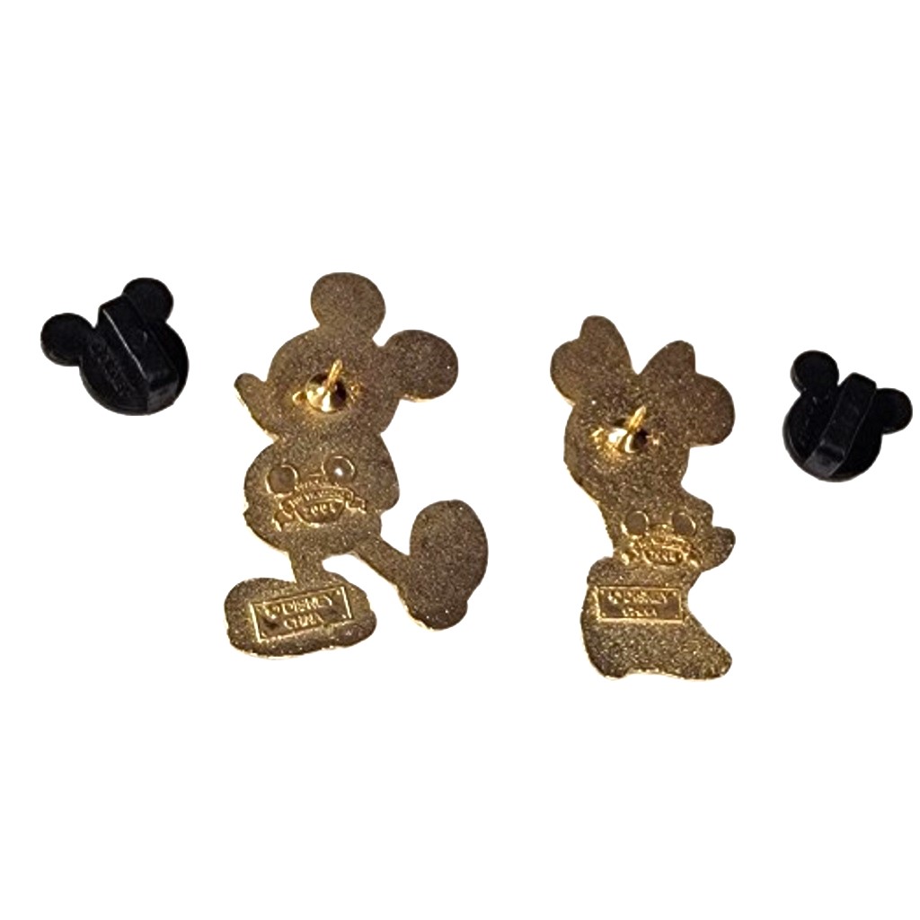 Minnie mouse and Mickey mouse enamel pins. The pins feature Minnie with a red rhinestone bow and dress, and yellow silver trim shoes. Mickey has red rhinestone pants and yellow silver trim shoes. The pins have black ear shaped pin covers.