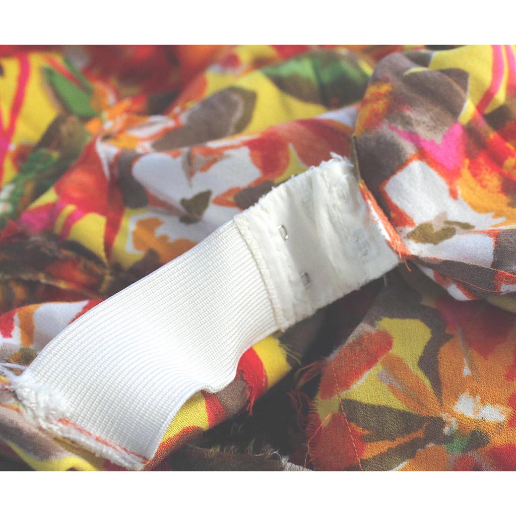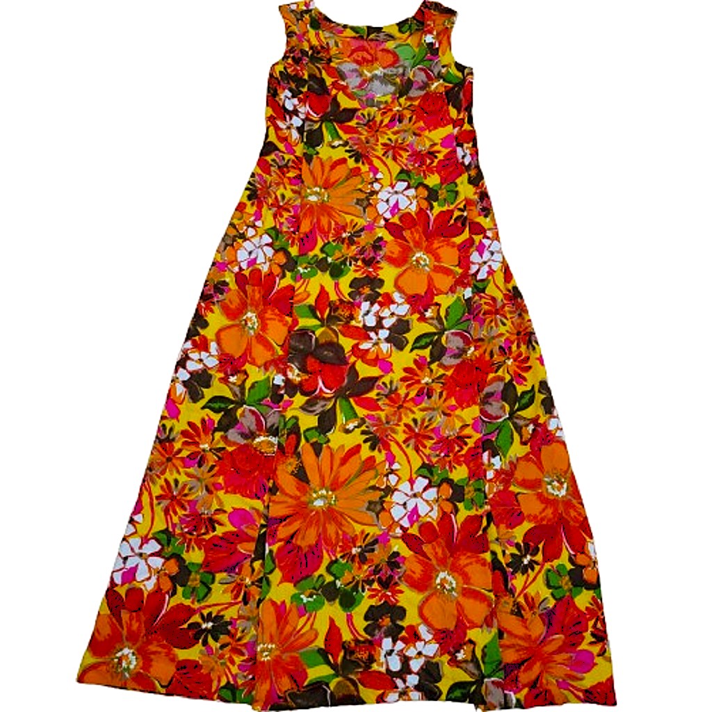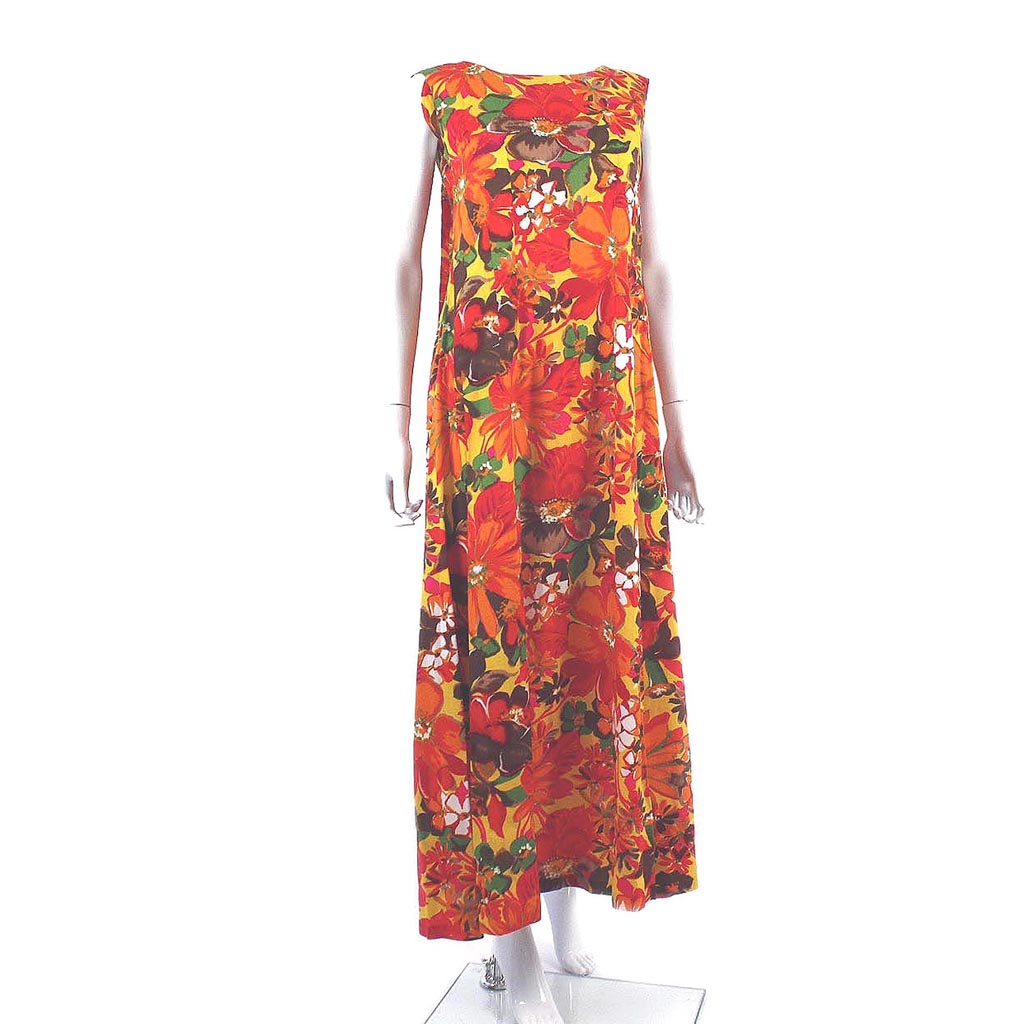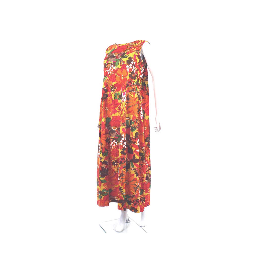 Vintage tropical colorful hibiscus flower print 50s pull over sleeveless midi dress. The dress features: scoop back, back shoulder drop “Watteau” pleat, and a interior elastic adjustment size strap. The flower colors are vivid: red, yellow, green, pink, orange, brown, and white. The dress would be great for lounging, party or any get together. The dress doesn’t have a label but we think it is possibly by Waltah Clarke’s Hawaiian Shop?