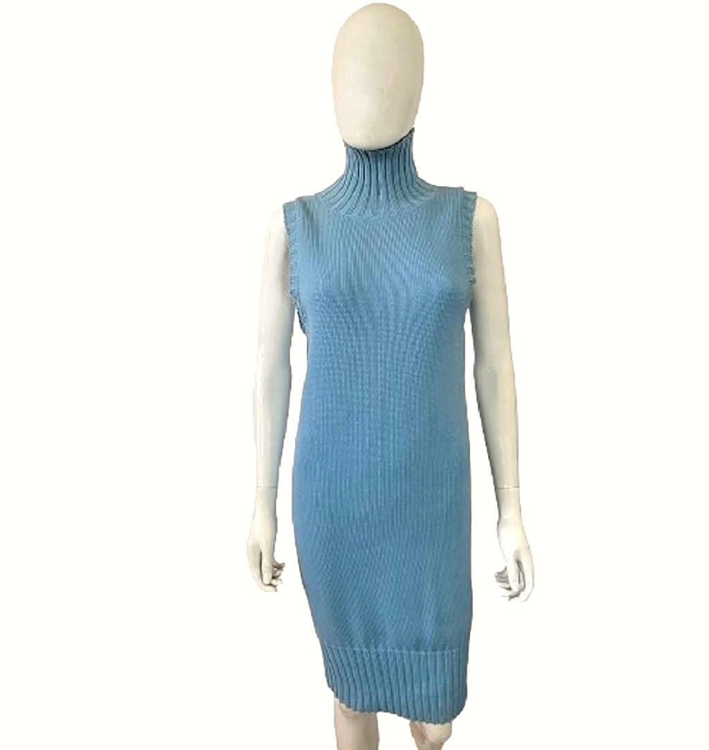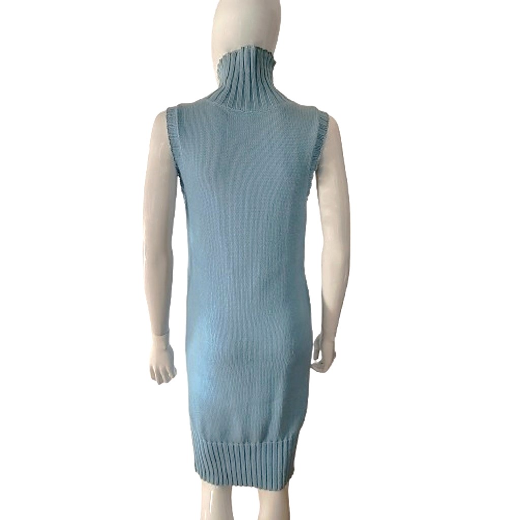 Betsey Johnson baby blue 80s pink punk label vintage sweater dress. The dress is pullover style, sleeveless, with a stand-up ribbed collar. The sleeveless arm opening edge, and bottom both are ribbed. The upper portion of the collar looks a tinge lighter which happens with age. The last photo shows the “inside” portion where you can see more of a pastel blue. On the outer portion you can hardly see it at all. Overall the dress is in very good pre-owned vintage. If you have any questions please email.