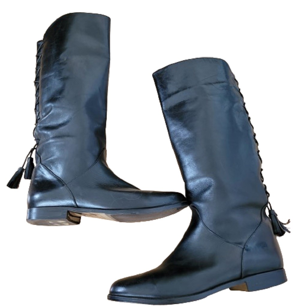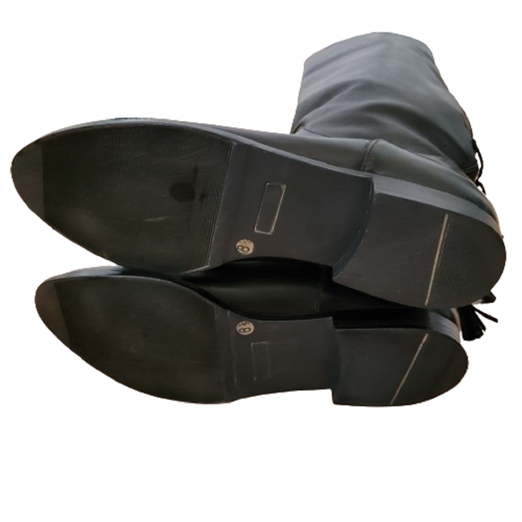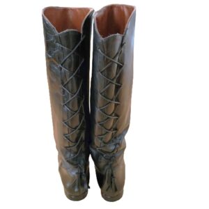 Bloomingdale’s black leather lace back vintage riding style boots. The boots have a string lace up back with double hanging end tassels. The boots are pull on style size 8M.