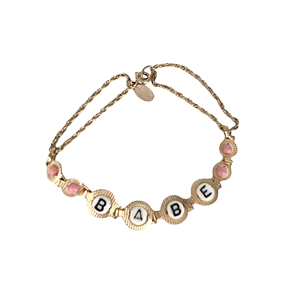 Faberge vintage gold electroplated cologne promotion bracelet. The bracelet features: pink and white square shapes with black letters that spell “Babe.” The squares can spin and show Babe on both sides. The letter “a” on one of the sides colors is a slightly faded (see photo). The tag is stamped Fabergé Inc. 1975 with a copyright symbol. On the back of the tag is stamped Gold Electroplated.