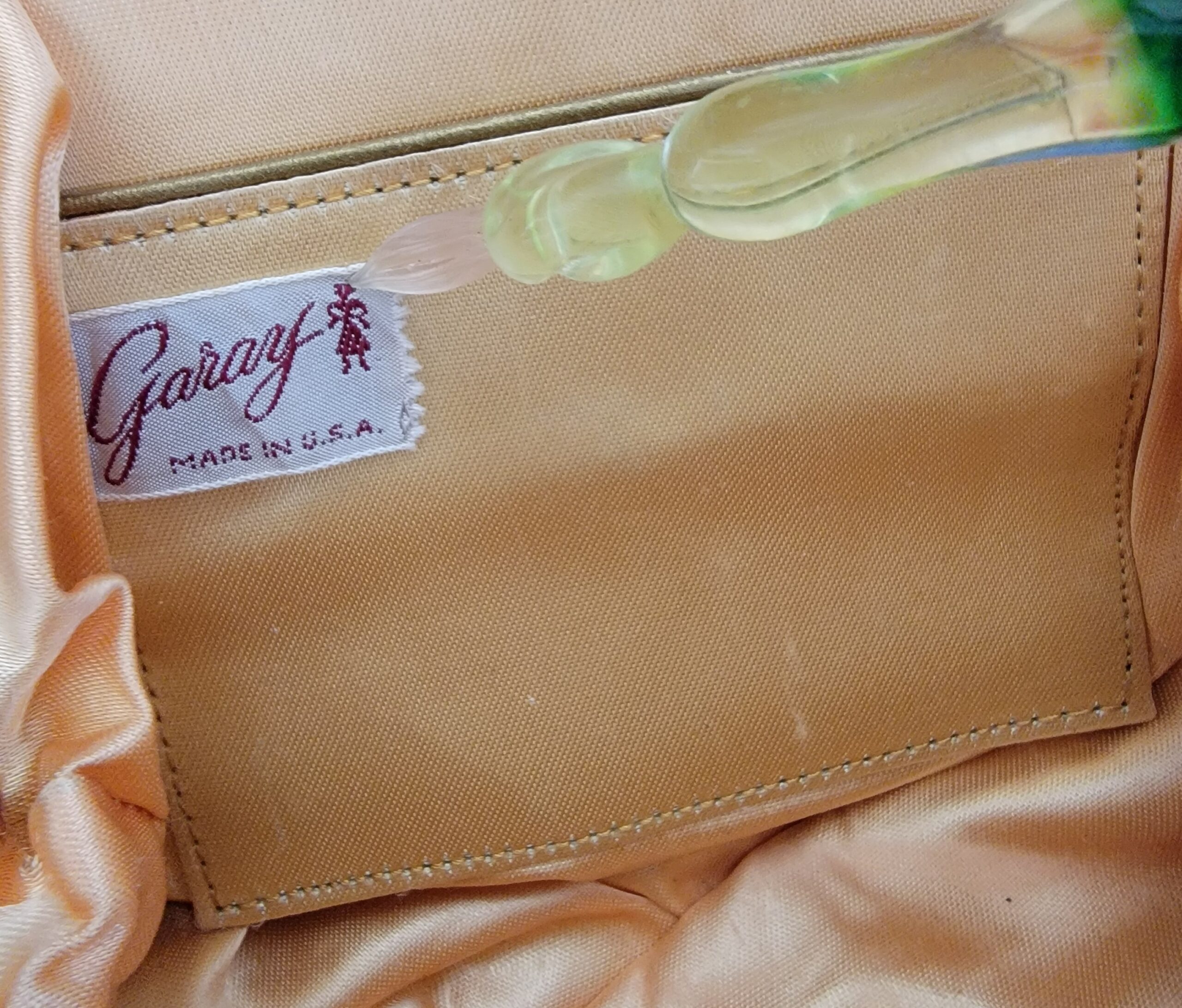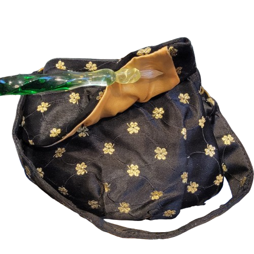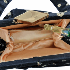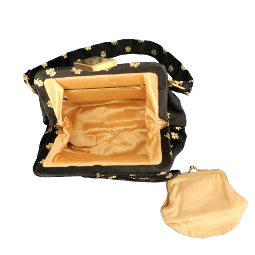 Garay evening bag with inside matching coin pouch, and a inside pocket compartment. The bag is black fabric looks like satin not sure with gold embroidered flower accents, a single strap,